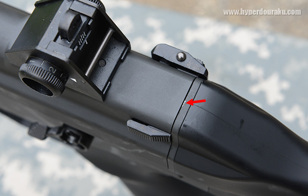 組み立てる際にテイクダウンラッチを押し込まずにレシーバーを閉じようとするとリコイルガイドの突起がストック側にあたって傷がつくので注意。