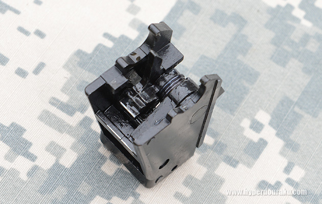 矢印の部分がホールドオープンした際にボルトストップと噛み合うパーツ。スプリングが効いていてショックを吸収し、破損を防ぐ「Z-システム 89式ver.」。