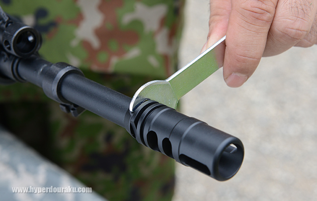フラッシュハイダーはダブルナット方式なので、取り外すにはまず、付属のバレルナットレンチを使用してバレルナットを緩める。ネジロック材が付いているのは最初はものすごく固い。