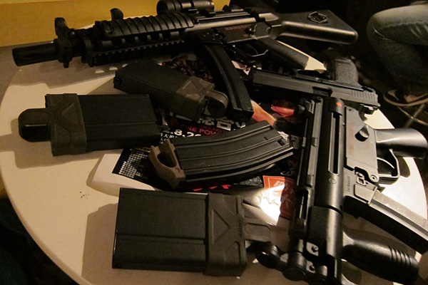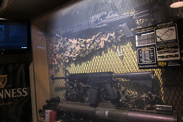 壁にもエアガンが。EBR、M4カービン、LAWなど。マニアック。