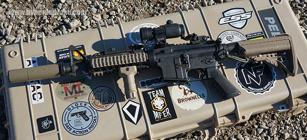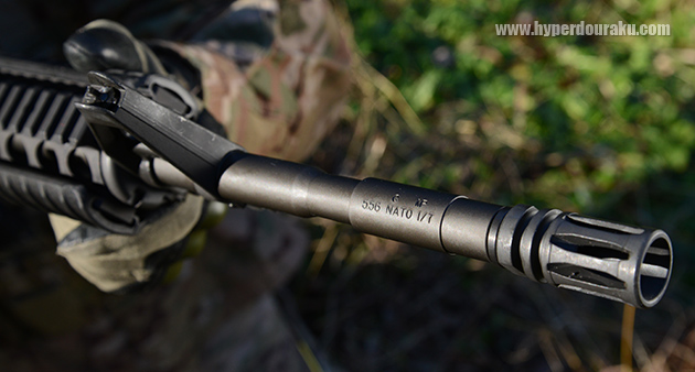 A2バードケージフラッシュハイダーに装着できるPTS製のGriffin Armament M4SDII モックサプレッサーを装着。着脱も簡単。