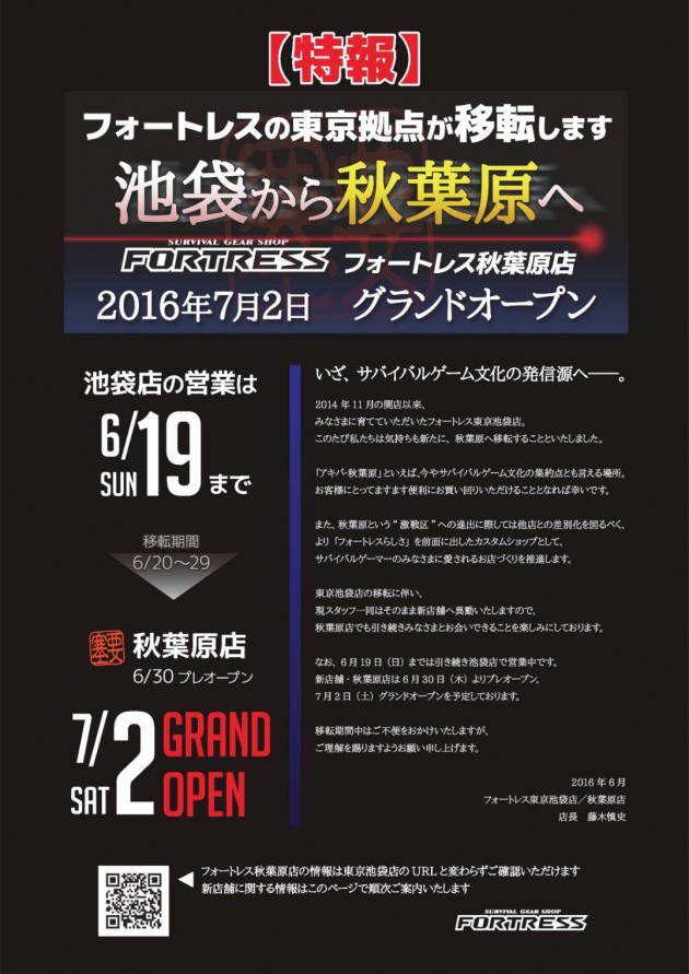 エアガンショップ 『フォートレス』が秋葉原に移転!! 2016.06.13 ショップ 要塞こと、エアガンショップのフォートレスが現在の池袋から秋葉原へと移転するそうです!! 7/2(土)、グランドオープンです。 場所はASOBIBA秋葉原店の目の前になります。 公式ブログでの告知 http://bukurofortress.militaryblog.jp/e773540.html 関連リンク2017年11月1日 第2回むげんモデルガンファイアーフェスティバル レポート2021年6月18日 41PXが屋内型サバゲーフィールド「AREA41 YOKOHAMA (エリアフォーティーワンヨコハマ)」を7月オープン2017年9月11日 EasySHOOOOOTING!が八王子にオープン2021年7月14日 CYBERGUNとGLOCKの日本正規代理店の公式サイトがオープン