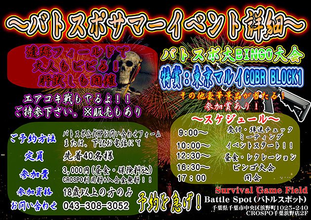 この夏7/30(日)に総合アミューズメント施設「CROSPO」のインドア・サバイバルゲームフィールド、「Battle Spot」にて、サマーイベント開催が決定!!