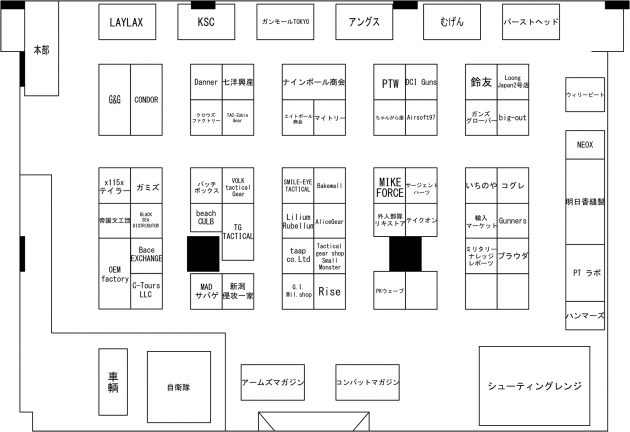 ●出店業者(2月15日現在)…株式会社ケーエスシー/G&GJAPAN/CONDORJAPAN/laylax/DANNER/ガンショップアングス/AIRSOFT97/ウィリーピート/むげん東京店/GUNMALL TOKYO/明日香縫製/ハンマーズ/P.T.LABO/VOLK TACTICAL GEAR /CROWS’Sfactory/マイトリー/Gamis/OEM FACTORY/LoongJapan2号店/NEOX/ BLACKSEA DISTRIBUTOR/Rise/TRi.S workshop/GUN’z GLOVA/sacom works/x115xTAYLOR/TG-TACTICAL/いちのや/Big-Out/エイトボール商会/ヘタレンジャー/鈴友株式会社/外人部隊リキストア/BURST-HEAD/新潟侵攻一家/TAKE ON/帝国文工団WW3/DCI GUNS/ガンナーズ/BLACK LINE/TAC-ZombieGear/taap-shop/七洋交産/輸入マーケット/sacomworks/SMILE-EYE TACTICAL/MIKE FORCE/C-Tours LLC/ミリタリーショッププラウダ/Bakewall/BaseEXCHANGE/AliceGear/G.I. Mil.shop/コグレ/Lilium rubellum/MAD WARRIORS SURVIVALGAME/ARMSMAGAZINE/COMBATMAGAZINE/SATMAGAZINE/自衛隊/PTW/Tactical gear shop Small Monster/NEOX/サージェンツハート/プラウダ/OEM-FACTRY