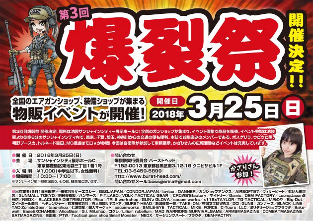 第3回目爆裂祭 開催決定! 場所は池袋サンシャインシティー展示ホールC! 全国のガンショップが集まり、イベント価格で商品を販売。イベント会場は池袋駅より徒歩8分のサンシャインシティ内で、東京、千葉、埼玉、神奈川からの交通の便も便利。本誌でお馴染みのメンバーである、ボスゲリラ、ウピウピ隊、毛野ブースカ、トルネード吉田、MC担当はモロ★が参戦! 今回は自衛隊が参加して車輛展示、かざりさんの広報活動などイベントは充実しています。