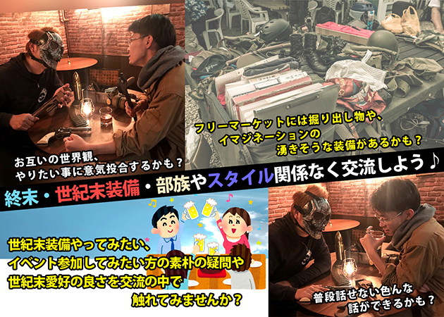 いろんな人が集まるサロン・ド・世紀末だからこそ話せる装備や衣装についての交流、各々の考える世紀末愛好の魅力や遊びの各スタイルやジャンルの話から、サバゲやトイガンの魅力や体験型イベントの体験談等に触れてみたい方、知ってみたい方の疑問が交流の中で解決できるかもしれない。交流を深める為にマイカップの持参(交流会時間中自己責任にて使用可能)を推薦しており、交流の話のタネには欠かない演出が施されている。