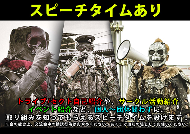 そんな中、交流会の中でトライブやセクト、または愛好家サークルや個人、物販者、アーティストを問わず、昨今の活動やこれからについて周知共有する場所を設けられるようだ。