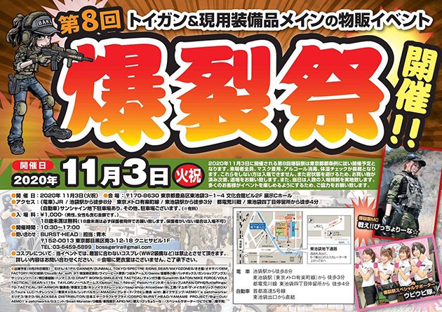 2020年11月3日に開催される第8回爆裂祭は東京都都条例に従うことになります。開催出店業者、来場者全員、マスク着用、アルコール消毒、体温チェックが義務となります。これらをしない方は入場できません。また蜜状態を避けるため、お買い物が済み次第、退場をお願い致します。