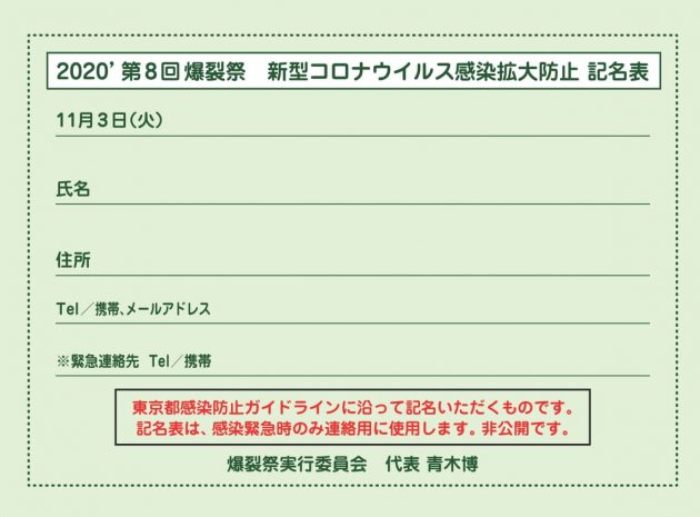 下記のコロナウィルス感染拡大防止用機名表に連絡先を明記の上、会場に来場をお願い致します。会場内に設置した回収BOXに入れて頂きます。