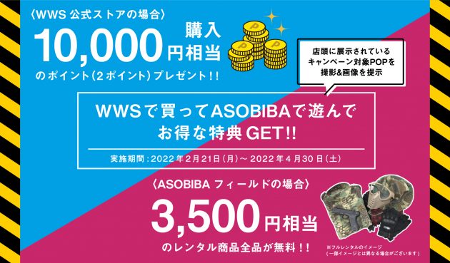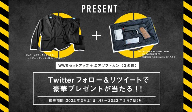 コラボ第一弾として、2022年2月21日(月)から「WWS×ASOBIBAコラボキャンペーン」を実施。WWSセットアップとスーツに似合うエアソフトガンが抽選で3名様に当たる「Twitterフォロー&リツイートキャンペーン」は2月21日(月)から3月7日(月)まで。WWS公式ストア(Flagship Store新宿・八重洲地下街店)とASOBIBA店舗(秋葉原・池袋・新木場)にて双方の店舗に来店するとお得な特典がもらえる「ストアキャンペーン」は2月21日(月)〜4月30日(土)の期間で実施されます。