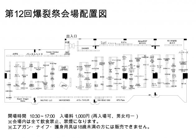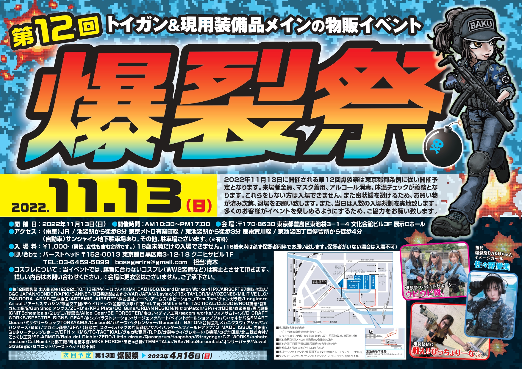 今年で12回目を迎える爆裂祭はトイガンや現用装備など全国のメーカーや小売店が集まる物販イベントです。