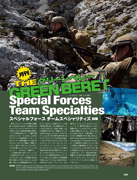 ●今月はチーム全体がどういった専門任務を請け負い、日々訓練を行なっているかを紹介。ODB(中隊)に配置される12名構成の6つのODA、その6つのチームに割り振られた専門分野について解説していきます。今回は各ODBに配置されるODAが持つ標準的な専門チーム、ミリタリーフリーフォールチームとマウンテンチームの2つをじっくり解説!