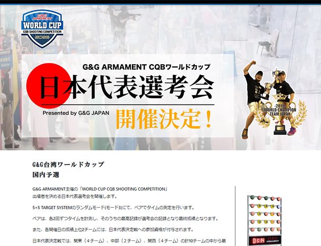 日本代表決定戦では、関東(4チーム)、中部(2チーム)、関西(4チーム)の計10チームの中から最終選考を行い、成績の良い上位2チームには、G&G ARMAMENT主催の「WORLD CUP CQB SHOOTING COMPETITION」への出場権が付与されます。