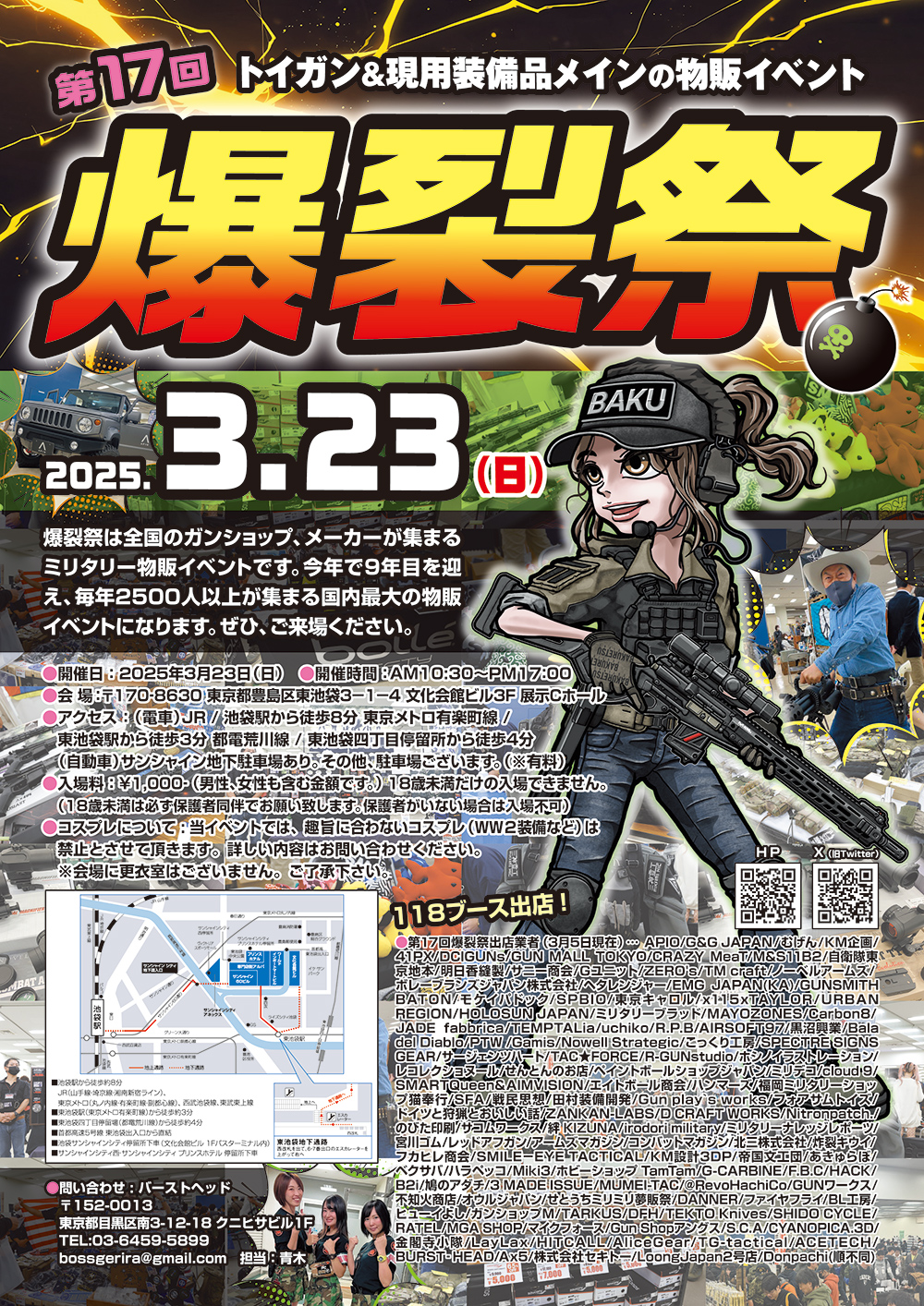 第17回 爆裂祭 2025年3月23日(日)開催! 2025.03.19 イベント トイガン&現用装備品メインの物販イベント、第17回 爆裂祭が2025年3月23日(日)に開催! 関連リンク2025年9月5日 遊園地でサバゲー!? サントピアウォーズが今年も開催!!2018年10月22日 柏市内 3 フィールドにて初心者向けサバイバルゲームイベント開催2022年7月18日 第10回『アリスペクターギア』7/30開催!!2017年11月4日 「UAB3」3on3トーナメント レポート by DEN