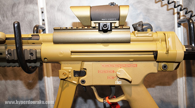 そして最後はMP5 MLI。MP5のリニューアルを望む声はよく聞きます。Mid-Life Improvementということで、トップレールアタッチメントや、レールハンドガードに、RAL8000カラーといったスタイルがカッコいいですよね。