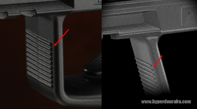 トリガーガード前面の滑り止めのモールドが微妙に異なることから、もしかしたら別金型かもしれません。