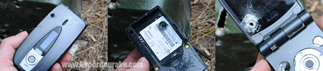 PS90の5.7mm×28弾で撃たれた携帯電話。弾はFNハースタルUSA社製のSS195LF カートリッジだ。