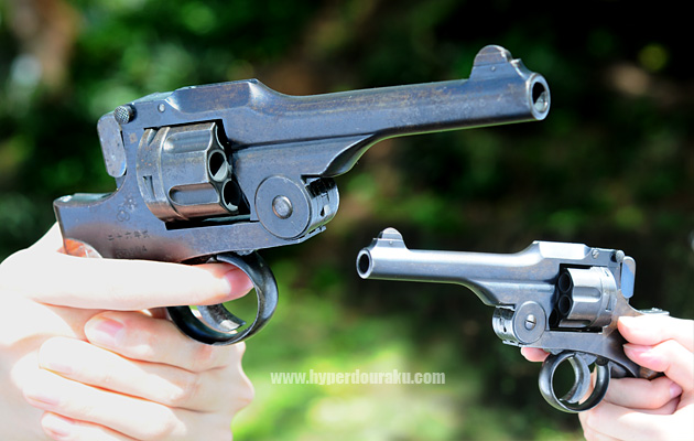 式拳銃。1893年(明治26年)に日本陸軍に制式採用された国産リボルバー。弾薬は二十六年式拳銃実包と呼ばれる9mm口径弾を使用する。イギリスのエンフィールド・リボルバーの様に中折れ式の装弾方法を採用している。