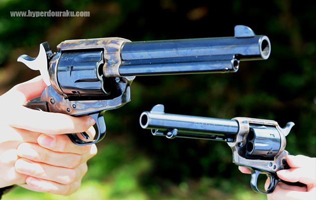 コルト シングル・アクション・アーミー(SAA)。弾は.45ロングコルト。ケースハードゥン仕上げのフレームが美しい。