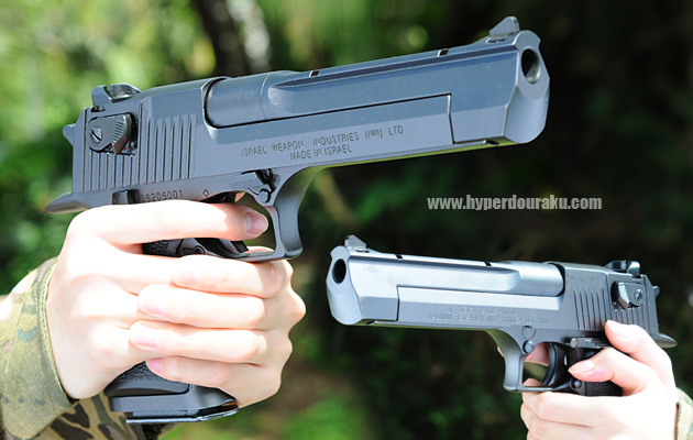 IWI デザートイーグル.50AE。イスラエル製の超大型拳銃。弾薬は.50AE(アクション・エキスプレス)弾を使用。いわゆるマグナム弾。反動はかなり強いので女性に撃たすには躊躇するけど、乙夜さんや上矢さんはこれを撃っちゃうんだから、なんという腕力...、いやガンコントロールの上手さ。