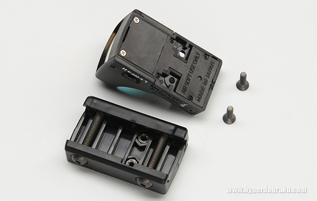 本体上面の2本のネジを外せば、本体とマウントベースを分解できる。マウントベースはピカティニー規格のレールに対応。