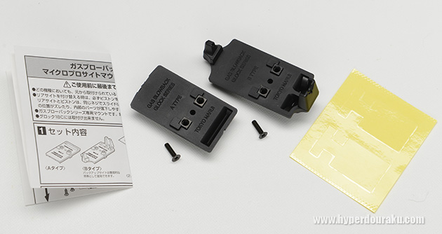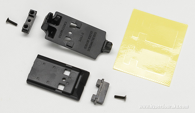 ネジ取り付け部分は亜鉛ダイキャスト製の別パーツとなっていて、一旦取り外して付属の保護シールを樹脂製のマウントベースに貼る。これで銃本体への傷付防止になるそうだ。