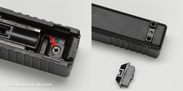 グロックのスライド裏にあるリアサイト固定ネジを外し、ベース取り付け用のダイキャストパーツに変更する。ネジはマウントベース付属のものを使用する。