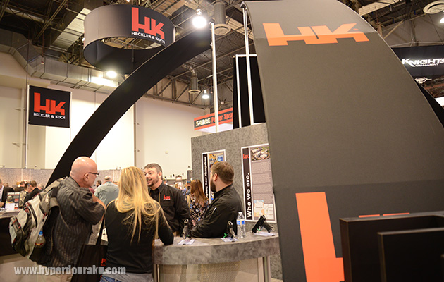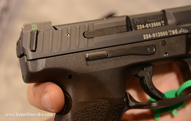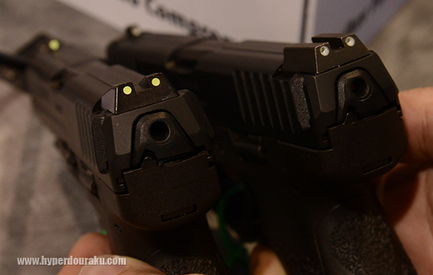 VP9はHKにしては珍しく、ストライカー方式のオートマチックピストル。スライド後部に指が引っかかるように突起がある。またサイトにはMEPROLIGHTのTRU DOTが搭載されるバージョンも展示されていた。
