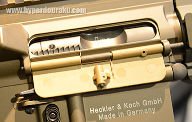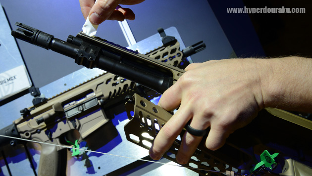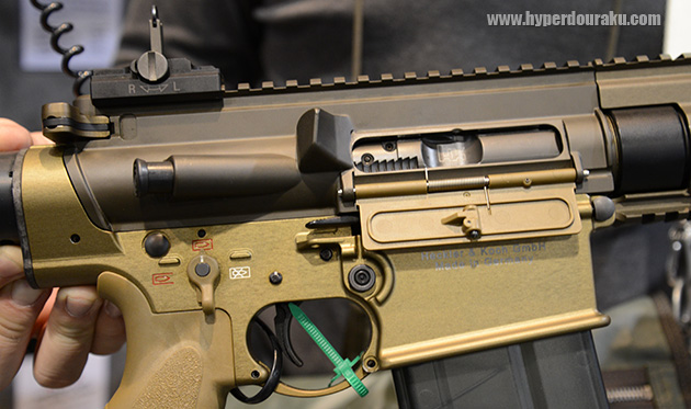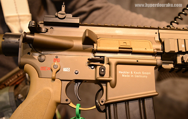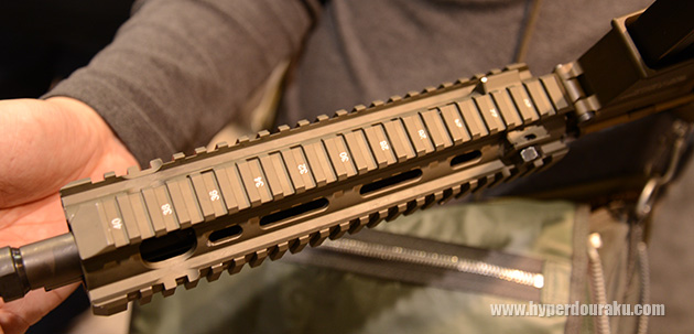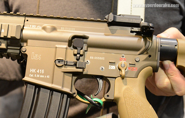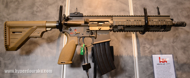 最新アサルトライフルのHK416 A5が展示されていた。口径は5.56mm×45弾。重量3.37kg。