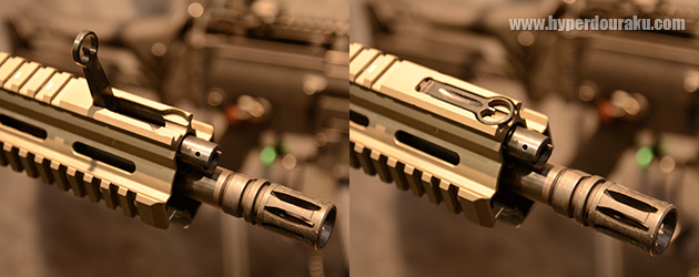 フロントサイトはレールハンドガードの埋め込み可倒式。