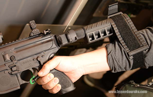 こんな感じでSBXストックは腕を通して握ることができる。つまりストックレスのピストルバージョンであり、あくまでSBXは安定補助器具と言う扱いらしい。