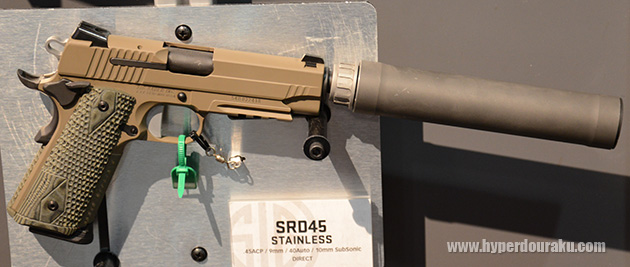 コマンダーサイズの1911 Cally ScorpionにSDR45サプレッサーを装着。カッコいいスタイルだ。
