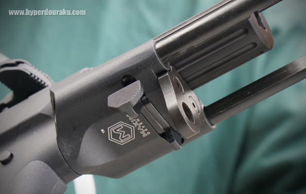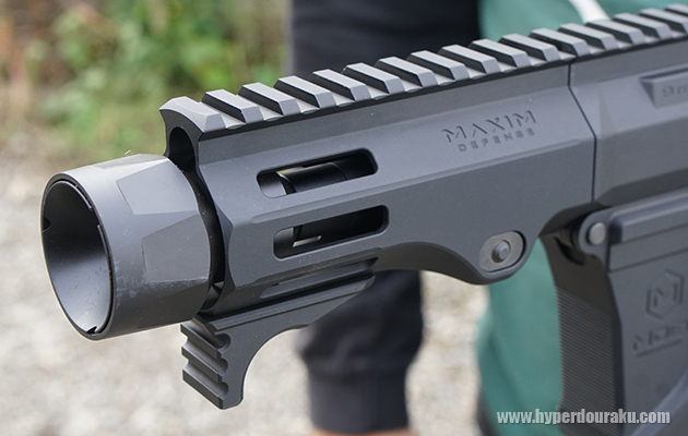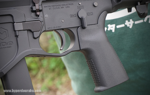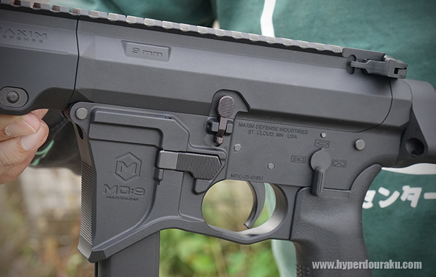 独特な形状のレシーバーはアッパーロア共に金属製。MAXIM Defencseオフィシャルライセンスによる刻印がマガジンハウジングに入り、セレクターのマークはピクトグラムとなっている。