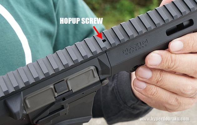 可変ホップアップはハンドガードとレシーバーの境目にある穴から六角レン氏を差し込んで行う。この位置は比較的調整しやすかった。