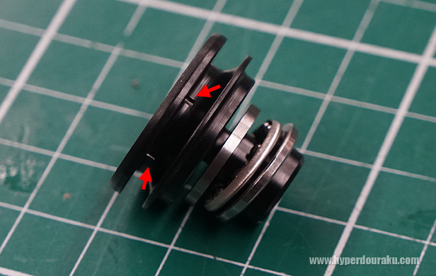 その他の違いとしては、ピストンヘッド裏側のネジ穴の出っ張り。マルイ純正と、カスタムパーツでは高さが異なるので、スペーサーを付ける場合には注意が必要だね。ピストンヘッドとピストンの間にワッシャーなどのスペーサーを入れると初速が上がるので微妙な初速調整で使ったりするね。