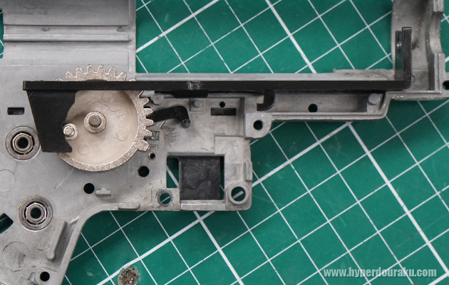 ギアがさらに回ると出っ張りに押されてタペットプレートが後退、つまりノズルも後退してBB弾をチャンバーへ給弾する隙間を作る。この時のセクターギアのギア歯をみてみると、ちょうどピストンを引き始める位置にあるんだ。