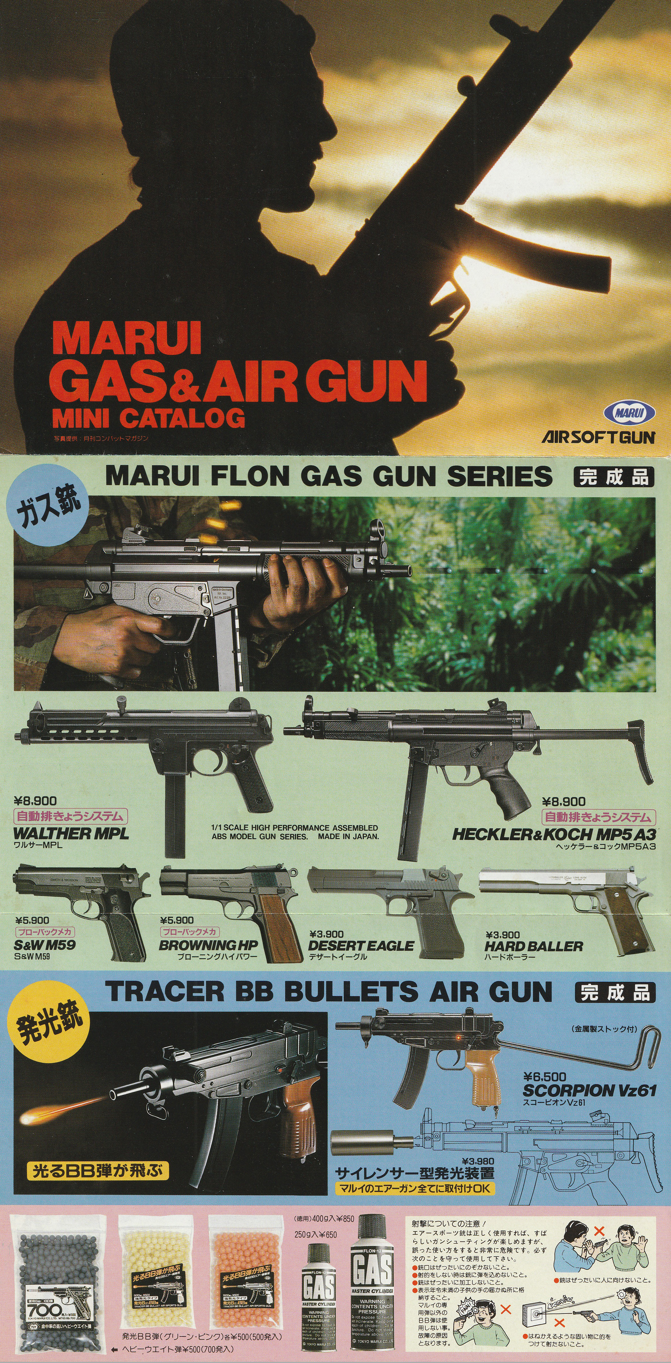当時のカタログ。ワルサーMPL、H%K MP5、UZIなどの長物エアコッキングガンはすでに発売されており、M16A1、XM177E2は発売予定となっている。カタログ表面、裏面。