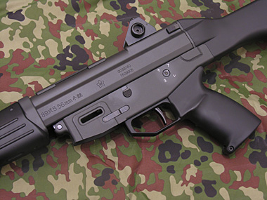 左側側面。89式5.56mm小銃と刻印があるが、最近製造された実銃には89Rと刻印されている。また、シリアルナンバーも一行となっている。
