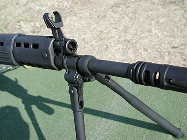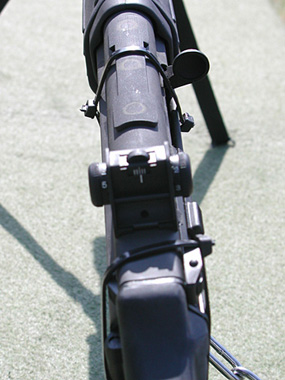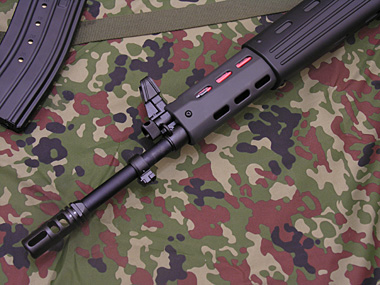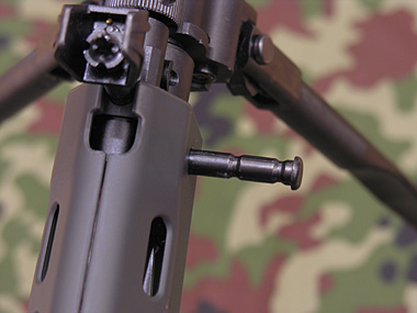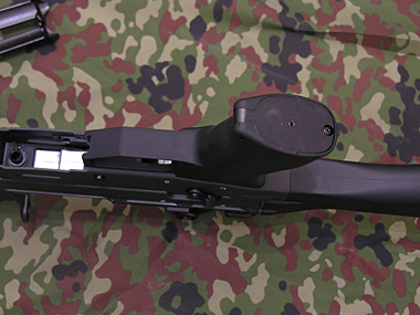 独特のフロントサイト、発射サイクルを調節するガスレギュレーターフラッシュハイダー、そしてバイポッドなどリアルに再現されている。銃を手にとってすぐわかるのがその剛性の高さだ。明らかにこれまでの電動ガンとは一線を画する剛性感で、フレームのギシギシなどは一切皆無。メタルフレームとアルミアウターバレルでがちがちに固めたM4フルメタルカスタムのような状態。各部をこぶしで軽くたたいてもゴツゴツと一本の鉄の塊のような響きを醸し出す。コレはスゴイ。