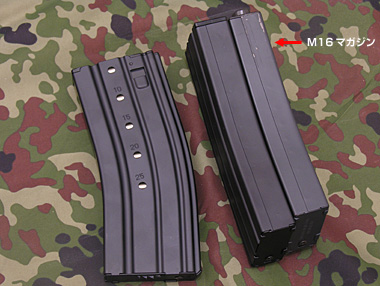 マガジンは付属で装弾数69発。残弾確認孔のある独自のものだ。オプションパーツで420連マガジンが発売されている。M16のマガジンと比較してもわずかに89式のほうが長い程度。M16系マガジンが89式には使用できるが、マガジン先端の形状のため、その逆はできない。