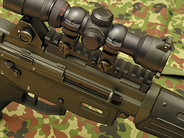 マルイ純正のマウントベースより高さがあるので、スコープを取り付ける際にリアサイトをパスしやすい。 なお、搭載しているショートスコープはハッコーのTAC-2628というモデル。 |