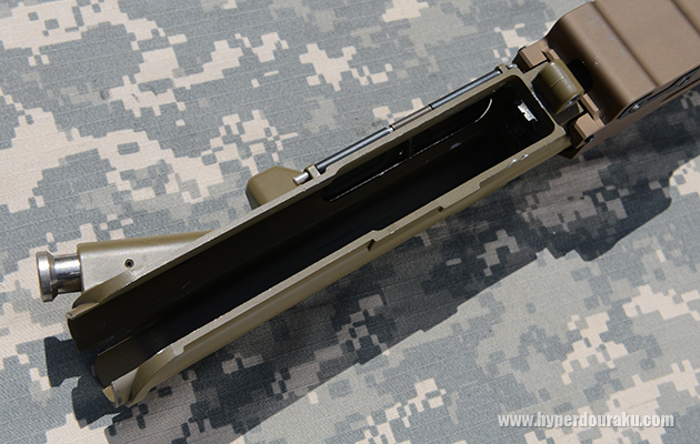 気になる内部構造だが、レシーバーの分解はフロント側のピボットピンを取り外すと、アッパーが前方へ引き抜ける電動ガン仕様となっている。