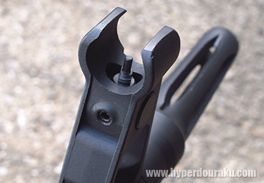 アウターバレル、フロントサイトも金属製で頑丈そのものです。フラッシュハイダー取り付け部は14mm逆ネジ仕様になっています。