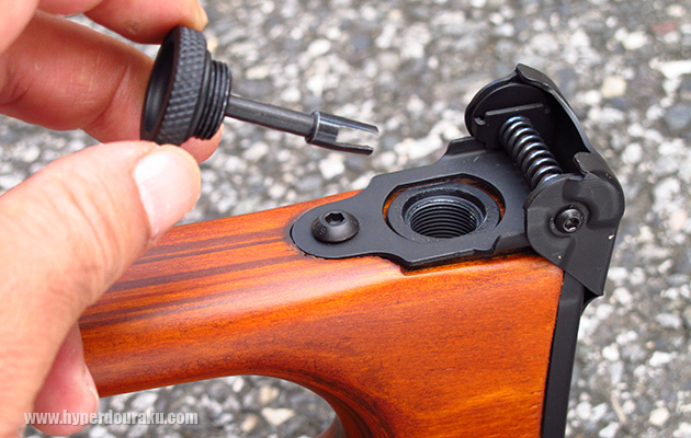 実銃もそういう機構なのかはわかりませんが、なんとストックエンドの丸いネジを外すと、フロントサイトのアジャストツールになっています!