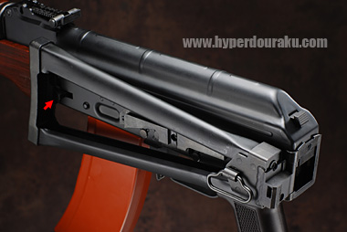 AKS74U、AK102同様のスチールプレス製のフォールディングストック。矢印のボタンを押してレシーバー左側面へ折りたたむことができる。