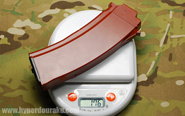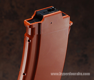 マガジンは赤茶色のベークライトタイプで、6mmBB弾を74発装填できる。
