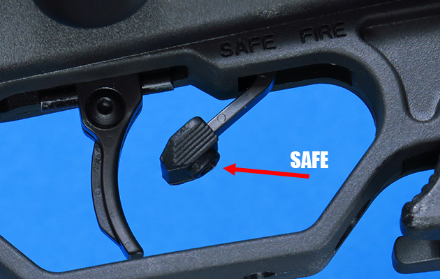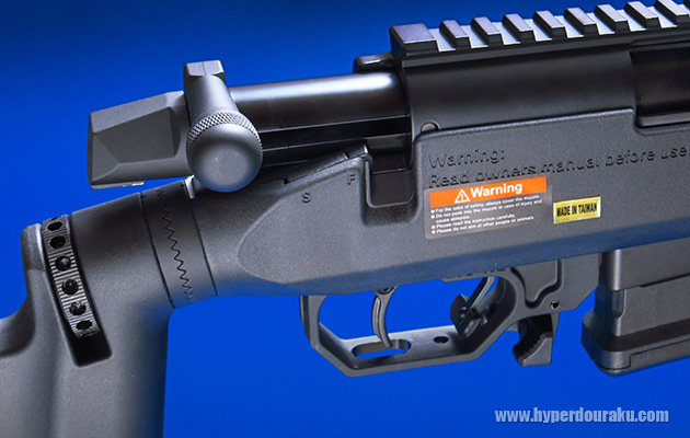 トリガー前にあるのが新型のセフティです。従来モデルはボルトハンドルの横にあったのですが、トリガーのすぐ前のレバーとなり、手前に引いてセフティオンとなります。