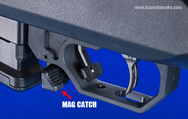 トリガーガード前、両側にあるのがマガジンキャッチでアンビ仕様です。前に押せばマガジンが取り出せます。マガジンキャッチのノブは形状が新しくなり、操作しやすくなりました。