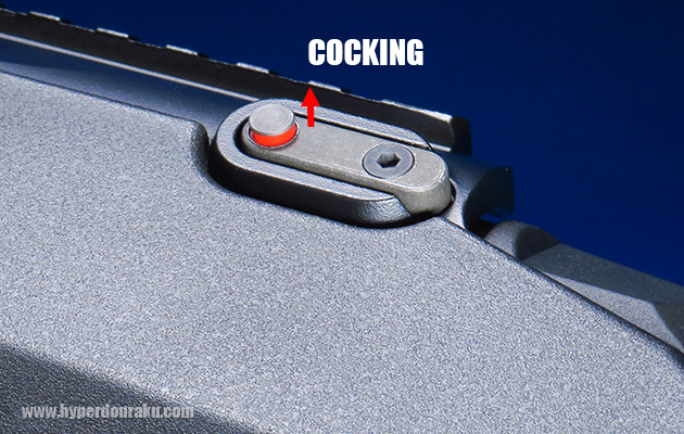 左面の後部にはコッキングインジケーターがあります。ボルトを引いてコッキング状態になるとインジケーターが突出して知らせてくれます。赤く塗られているのですぐにわかります。