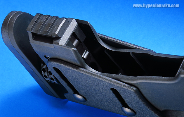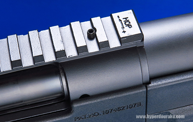 ただこの位置だとスコープを搭載するとマウントが邪魔して調整できない場合もあるので、可変ホップアップ調整ネジの位置や形状は、もう一工夫が欲しいところです。